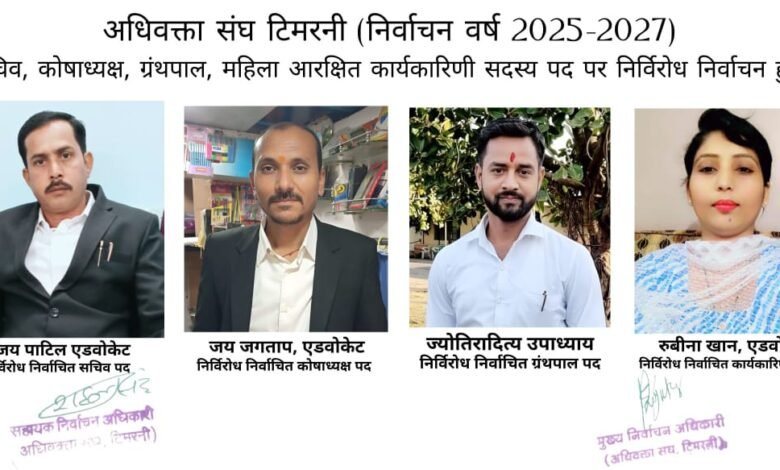 अधिवक्ता संघ चुनाव में अजय पाटिल सचिव पद पर, जय जगताप कोषाध्यक्ष, ज्योतिरादित्य उपाध्याय ग्रंथपाल पद, रुबीना खान महिला कार्यकारिणी सदस्य पद पर निर्विरोध निर्वाचित हुए