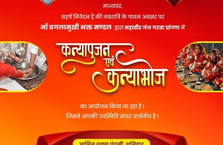 नवरात्रि पर्व के पावन अवसर पर पिपलियामंडी में श्रद्धा और भक्ति से परिपूर्ण एक विशेष धार्मिक आयोजन होने जा रहा है। माँ बगलामुखी भक्त मंडल द्वारा शनिवार, 27 सितम्बर 2025 को कन्यापूजन एवं कन्याभोज का भव्य आयोजन किया जाएगा। यह आयोजन महावीर गंज गरबा प्रांगण, पुराना गाड़ी अड्डा, पिपलियामंडी में प्रातः 10 बजे से शुरू होगा।