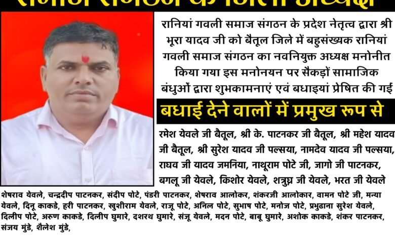 रानियां गवली समाज संगठन के प्रदेश नेतृत्व द्वारा श्री भूरा यादव जी को बैतूल जिले में बहुसंख्यक रानियां गवली समाज संगठन का नवनियुक्त अध्यक्ष मनोनीत किया गया इस मनोनयन पर सैकड़ों सामाजिक बंधुओं द्वारा शुभकामनाएं एवं बधाइयां प्रेषित की गईं