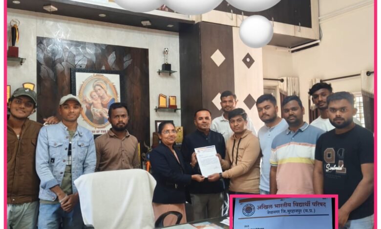 नेपानगर।अखिल भारतीय विद्यार्थी परिषद (एबीवीपी) ब्रह्मपुर प्रांत के अंतर्गत नेपानगर इकाई द्वारा नगर स्थित कॉन्वेंट विद्यालय में व्याप्त विभिन्न समस्याओं को लेकर विद्यालय प्रशासन को ज्ञापन सौंपा गया। एबीवीपी कार्यकर्ताओं ने विद्यालय की प्राचार्य सिस्टर टीना से भेंट कर विद्यार्थियों से जुड़ी समस्याओं से उन्हें अवगत कराया।
